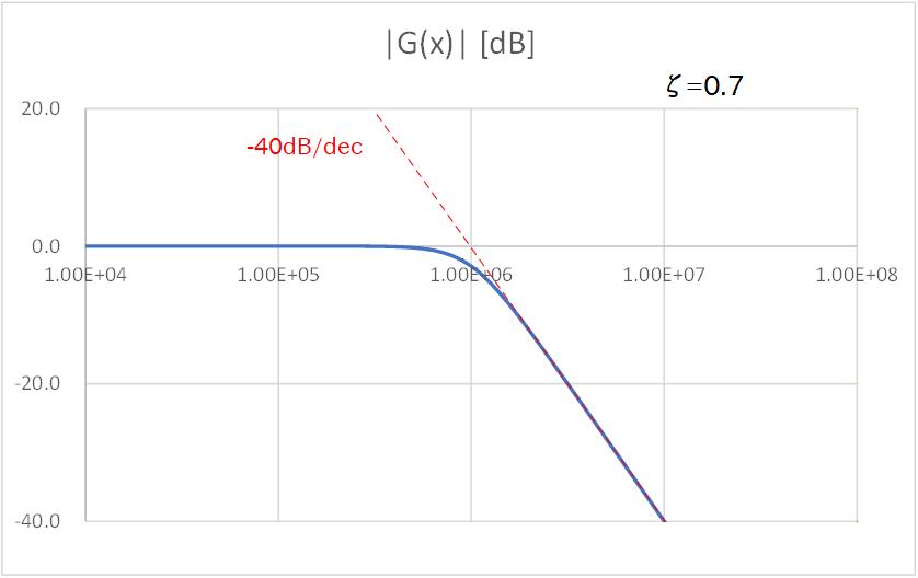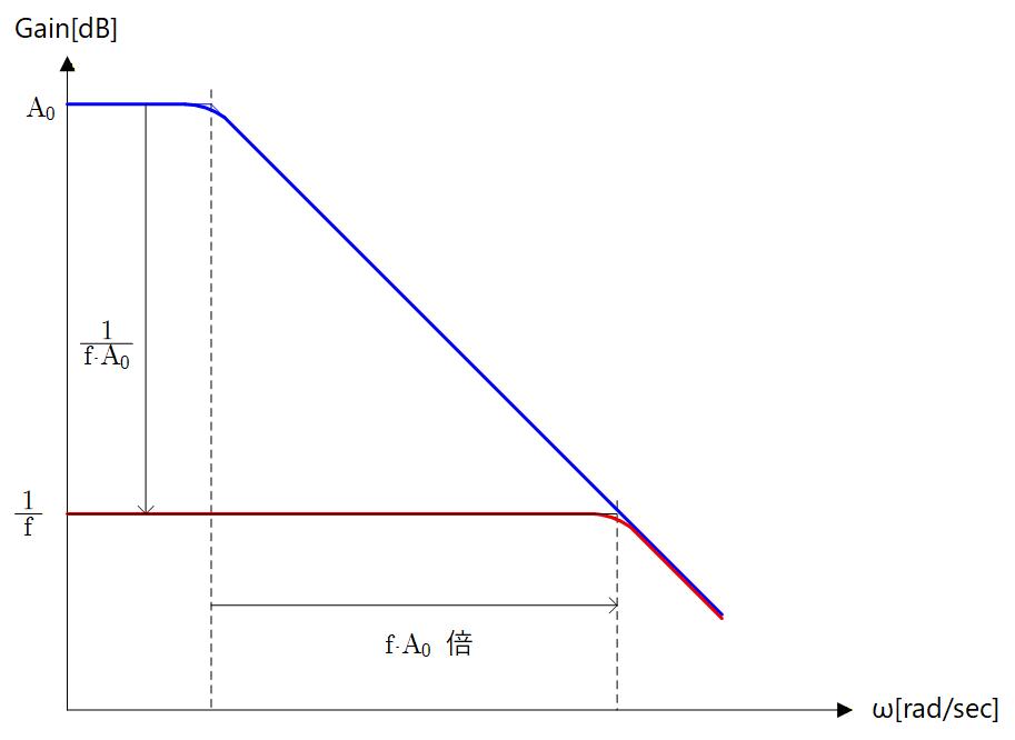 以上から DCゲインはもとの Open Loop ゲインの に対して になり、代わりに Pole 角周波数は 倍になることがわかります。 つまり、フィードバックによってゲインを抑圧した分だけ帯域を向上させることが可能となります。