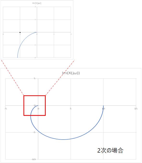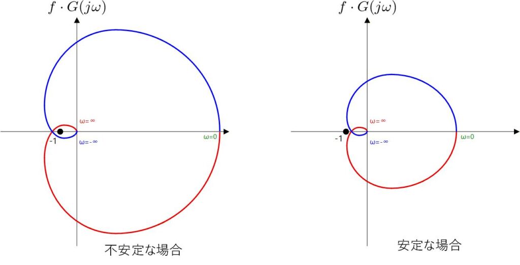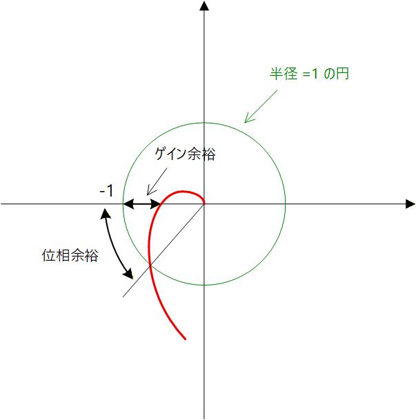 ここで、軌跡が (-1, 0j) の点を巻き込めば不安定、巻き込まなければ安定と判定されます。