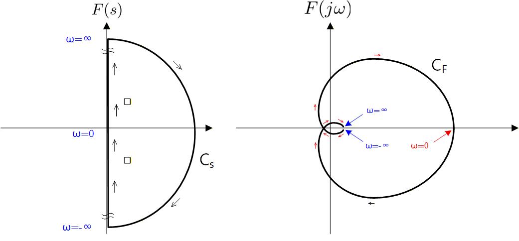 コーシーの偏角の原理から、 が、閉じた経路 CS 上で を動かすとき、 の軌跡 (CF) が原点を囲む回数 は、 の経路 CS で囲まれる領域内の Pole の数 から Zero の数 を引いたものに等しくなります。