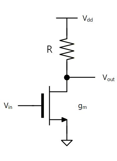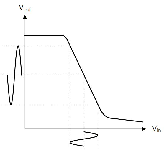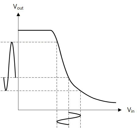 この時抵抗負荷のインバーターの入出力特性は線形な応答にはなりません。 これはトランジスタの動作領域が3極管領域に入るなどして、 が一定ではなくなり、ゲインが動作点によって変化するためです。