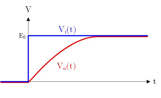 例として右図のように RC 積分回路にステップ入力を与えたときの振る舞いについて、ラプラス変換を使って解いてみます。
