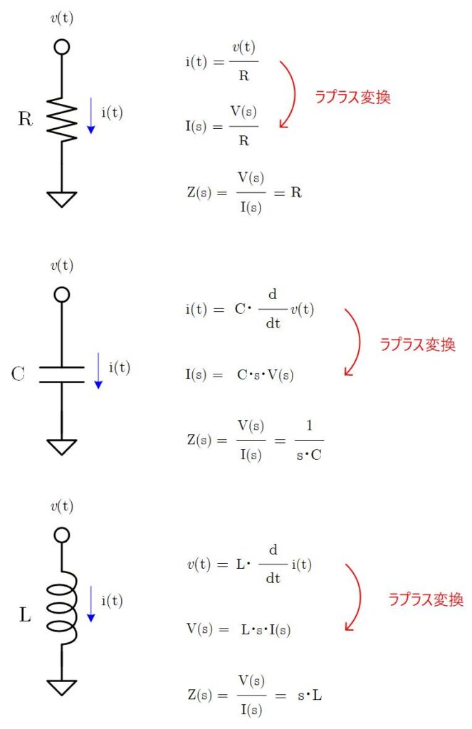 抵抗はラプラス変換しても R のままですが、容量は電圧の微分が電流になるのでインピーダンスとしては 1/s が、インダクタンスは電流の微分が電圧になるのインピーダンスとしては s が、それぞれ付与されるかたちになります。