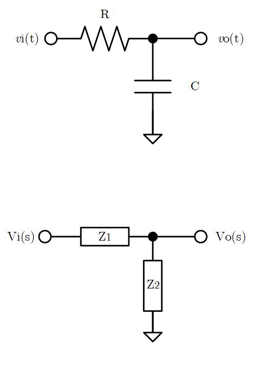 受動素子を使った回路については、それぞれの L, C, R のインピーダンスを直接ラプラス変換し、その Z(s) を回路トポロジ通りに組み上げることで、伝達関数が得られます。