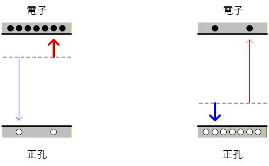 Fig. 1-2a の左図のようにバンドギャップの中心に対してフェルミレベルが伝導帯に寄っていれば 電子が増えて正孔が減り、N型となります。 逆に伝導帯の電子が Fig. 1-2b の右図のようにフェルミレベルが価電子帯に寄っていれば正孔が増えて電子が減り、 P型となります。