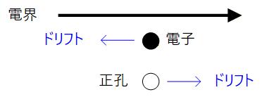 キャリアに電界がかかると正のキャリアは電界の方向へ、負のキャリアは電界と逆方向に移動しますので、電流として観測されます。