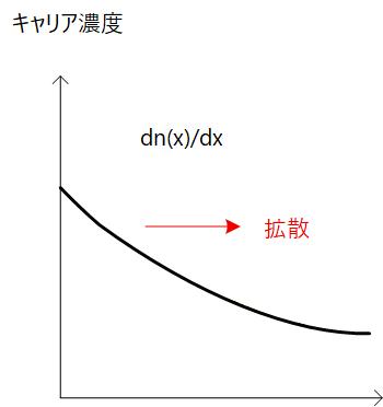 キャリアに濃度の勾配があるとキャリアは濃度の高いほうから低い方へと流れます。 キャリアは熱運動により一定個所にはとどまらずに拡散するために、結果的にキャリアは濃度が高い方から濃度の低い方へと動くことになります。