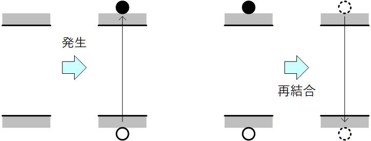 熱励起や光照射などがあると、電子と正孔が対として発生する現象があります。 また逆に電子と正孔ご再結合して消失する現象もあります。 このように発生と再結合か起こると、キャリア濃度自体が変化するために結果として電流に寄与することになります。