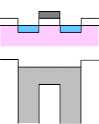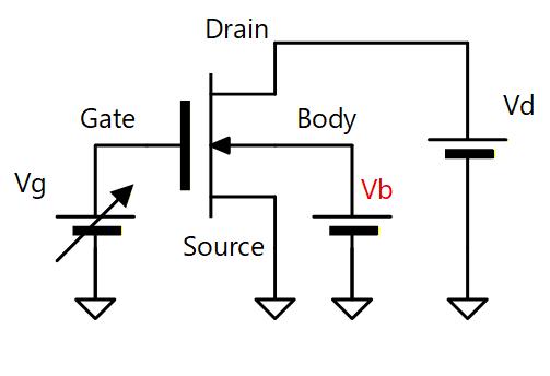 なお、これまで基板 (Body) 電圧は基板の下側から与えるような図で説明してきましたが、実際の集積回路では下図のように表面側から与えます。