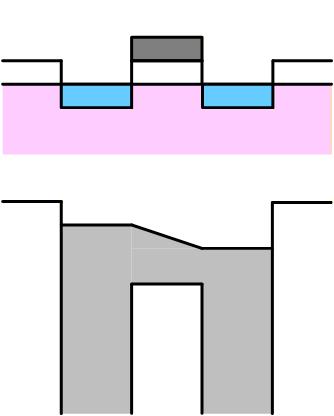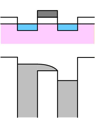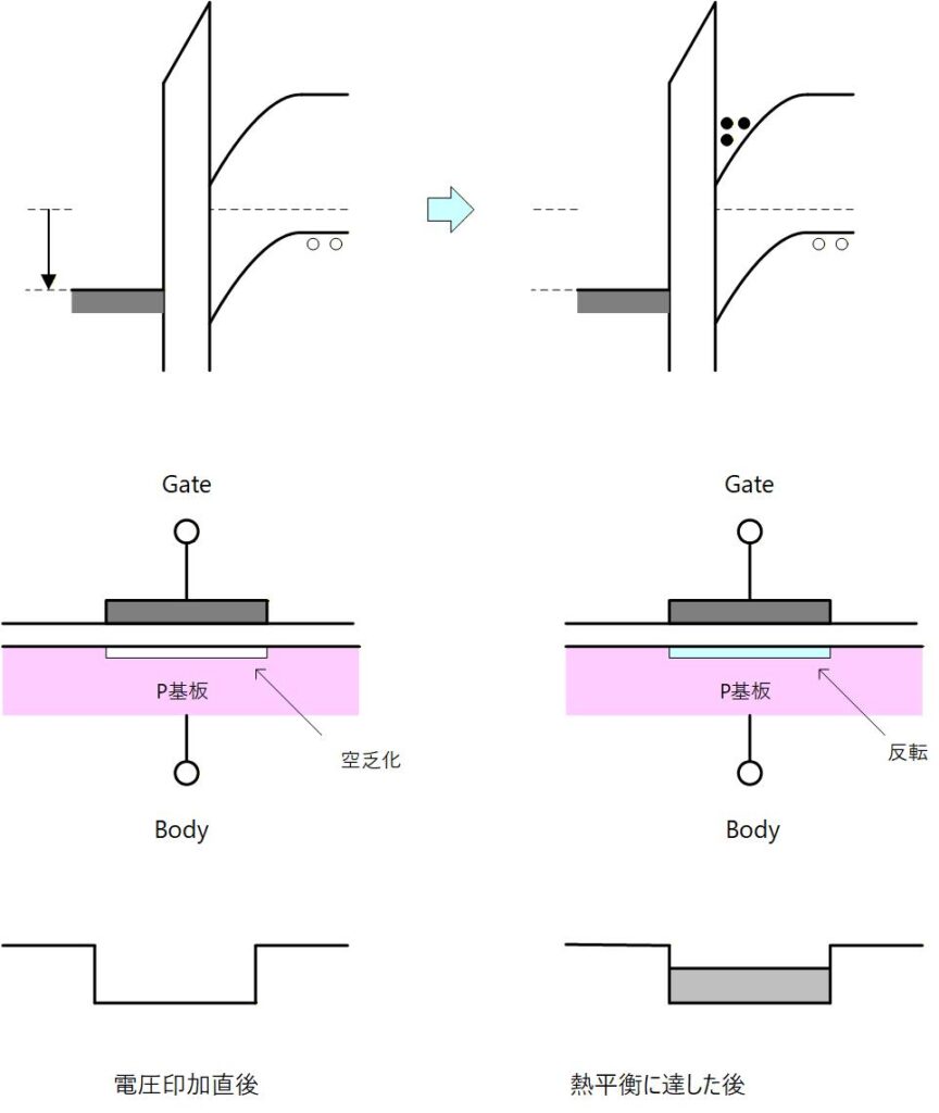 Drain電圧が高くなると、Channel には電子が誘起されてますので Source-Drain 間の電位差に応じた電流が流れます。 また図からわかるように 3極管状態ですので、電流は Channel ポテンシャル、すなわち Gate 電圧にも依存します。