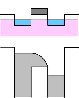 これを短チャンネル効果と呼び、ゲート長の短い微細化プロセスになると顕著になり、極端な場合は空乏層が Source 端まで延び、Source と Drain が短絡状態になる、いわゆるパンチスルーが発生します。 このため微細化プロセスになると Drain 電圧を下げる必要が出てきます。