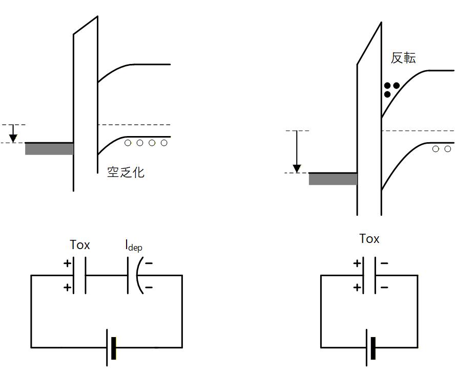 遮断領域では Gate と Body の間に、酸化膜容量と空乏層容量の直列接続容量ができます。