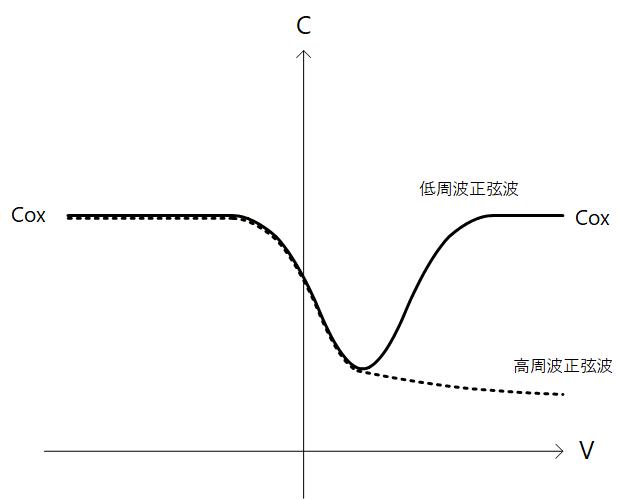 Gate電圧が Vth を超え、Channel に反転電子が誘起されると、Gate からは Channel との間の酸化膜容量が見えてきます。