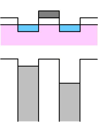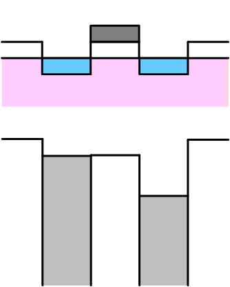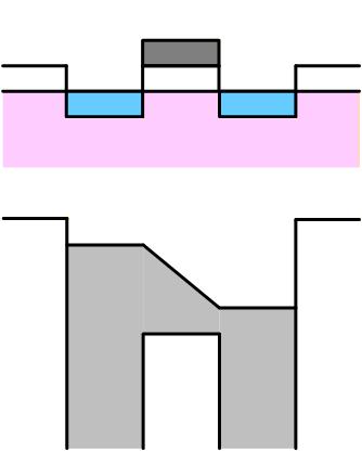 続いて右図のように、MOSトランジスタの Source とBodyを接地し、Gate にしきい値電圧 Vth より高い定電圧を与えた状態で Drain 電圧を 0V から高い電圧に Sweep していったときの状態の変化を ポテンシャル図で考えます。