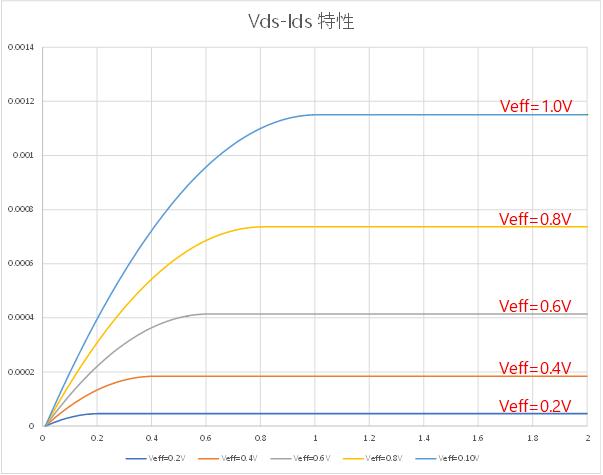 は先に述べたしきい値電圧で、 はこの を超えるまでは動作に寄与しません。 を超えた分の電圧が実効電圧として寄与するため、 を実効電圧 () と呼びます。
