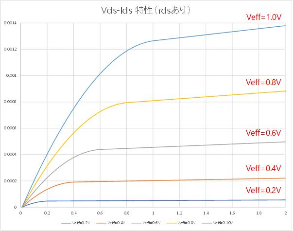 これは を微小変化させたときの の変化の割合を示すパラメータですが、アナログ回路設計においてはこの逆数をとった Drain 抵抗() の方が一般に使われる重要なパラメータになります。