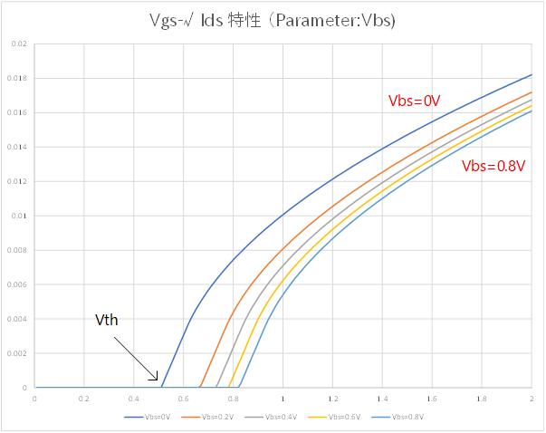 通常は Vbs=0V で使いますが、この後の講座で説明するソースフォロワや、差動対などではバックゲート効果が影響してくる場合があります。