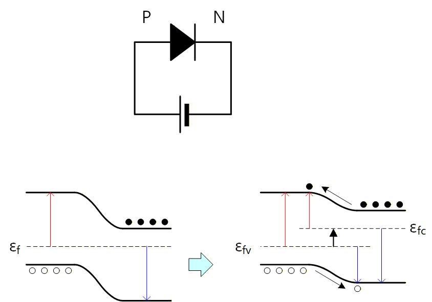 P領域では価電子帯と電子に対する擬フェルミレバルの距離が近づくため、電子のキャリア濃度がゼロバイアス時に対して増えることになり、N領域では伝導帯と正孔に対する擬フェルミレバルの距離が近づくため、正孔のキャリア濃度がゼロバイアス時に対して増えることになり、