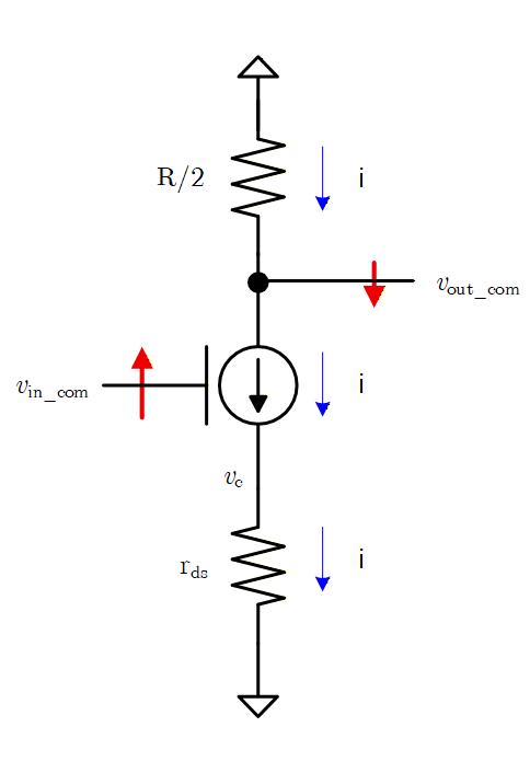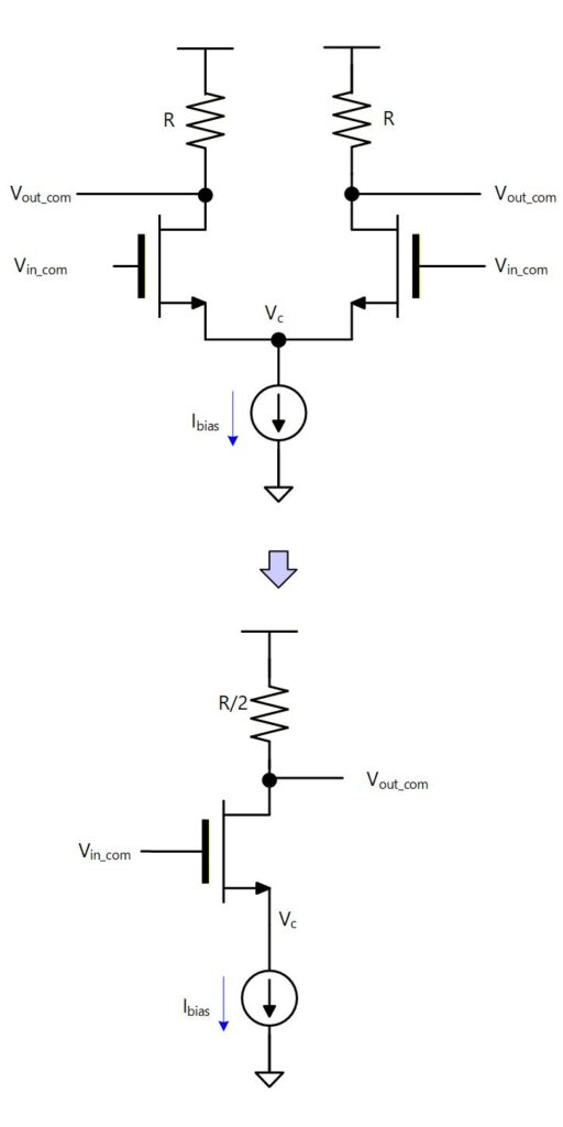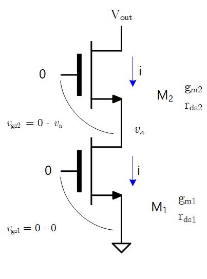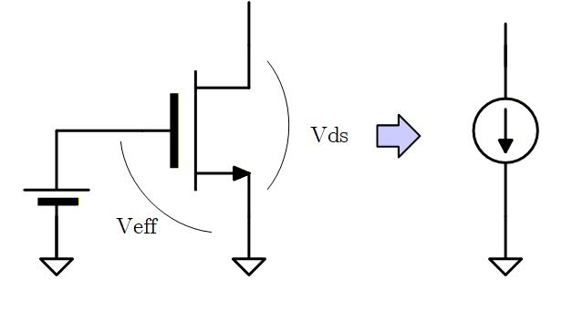 電源電圧は変化しないため接地となり、電流源のトランジスタは Gate 電圧固定で使うため、 による電流変化はなく、値が となる抵抗としてのみ働きます。