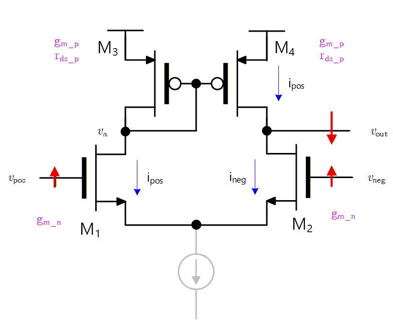 電圧が高くなると POS 側の NMOSトランジスタに流れる電流が増えます。 その電流は PMOS トランジスタにもそのまま流れ、それがカレントミラーで NEG 側の PMOS に折り返され、 ノードは流れ込む電流により電位が上がることになります。 この電流は から見える大きな出力抵抗によって電圧に変換されるため、 を正相で増幅することになります。